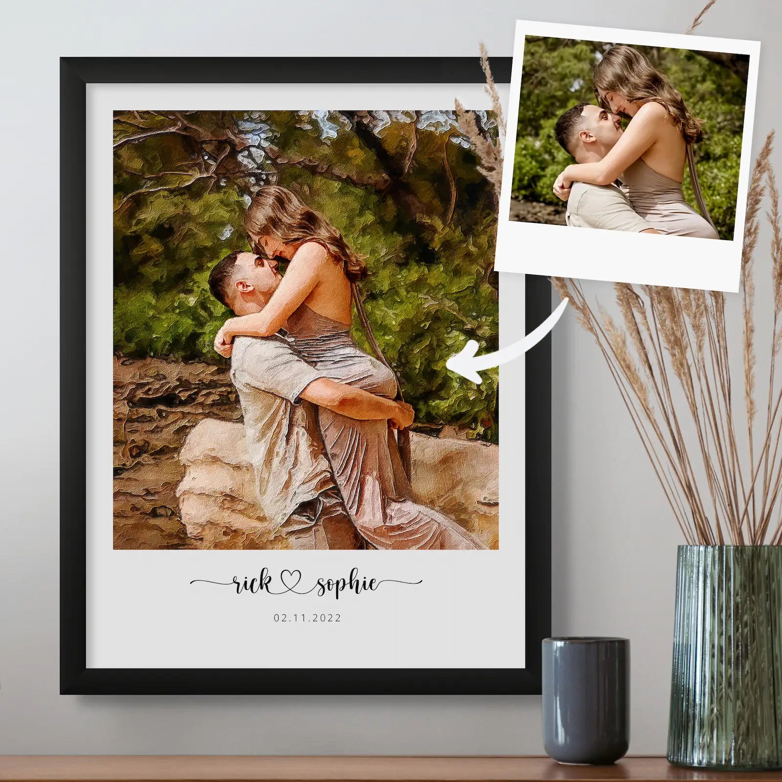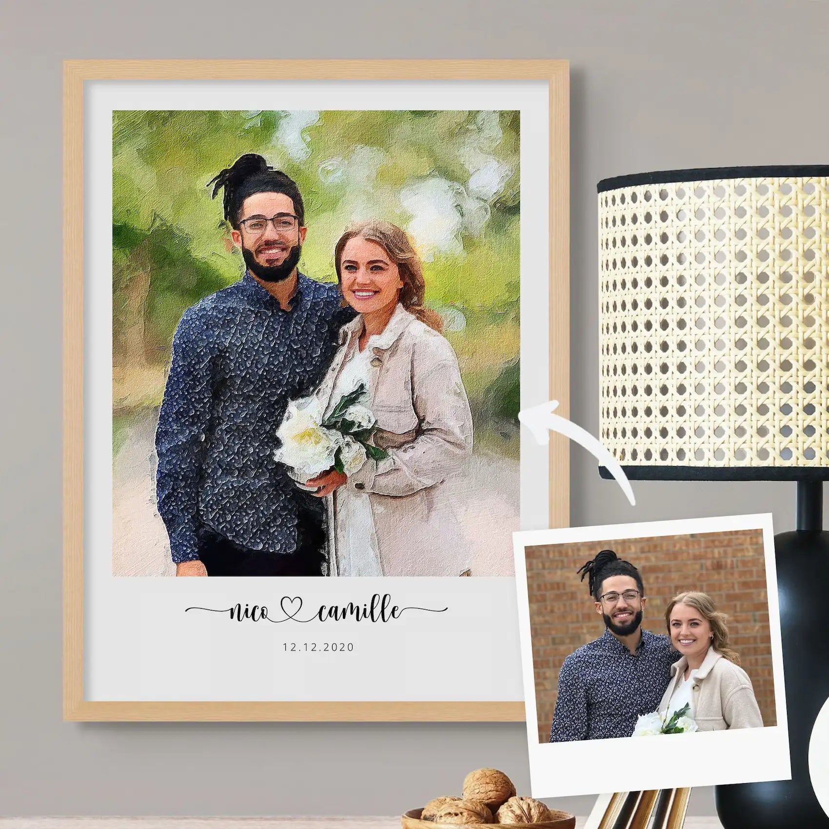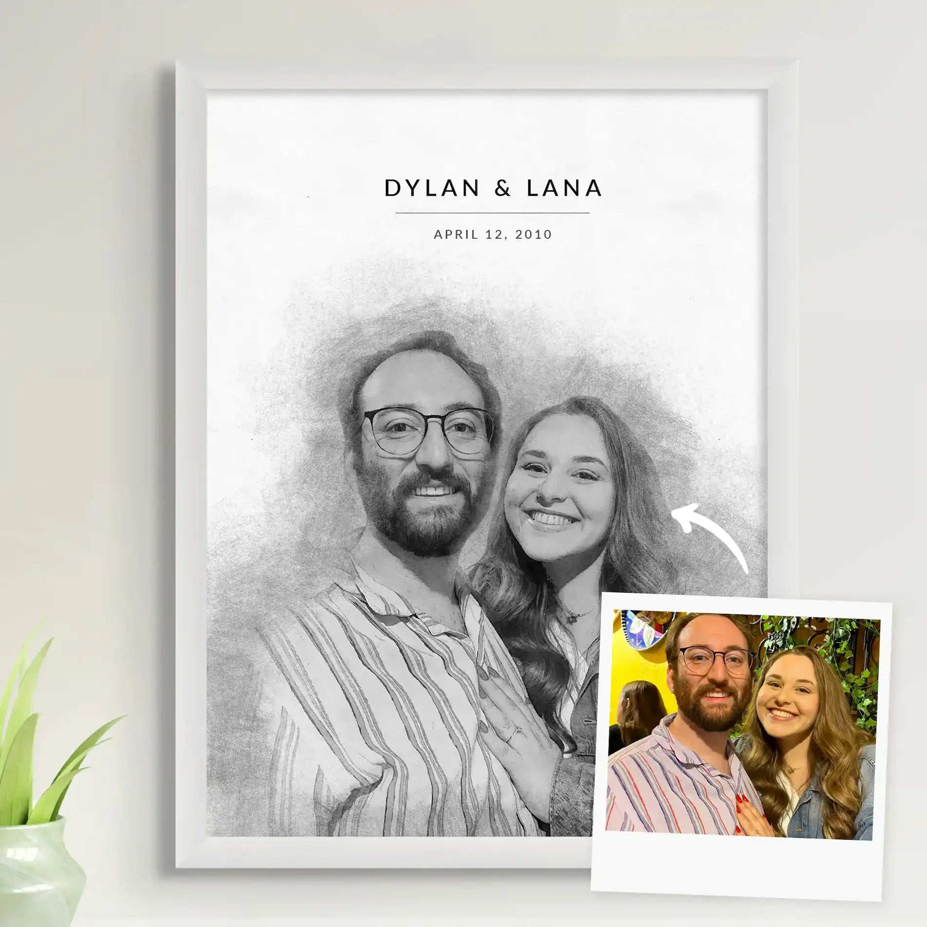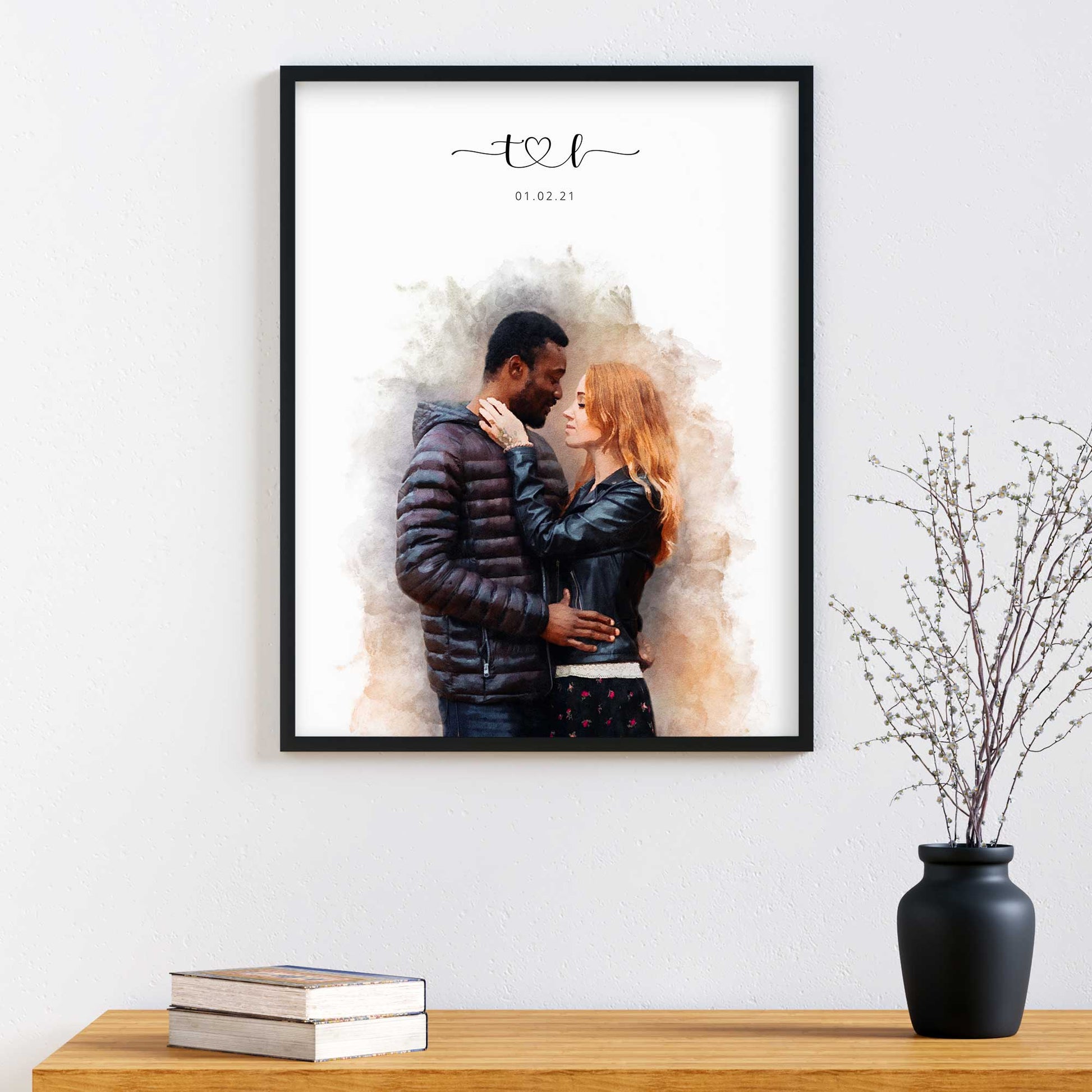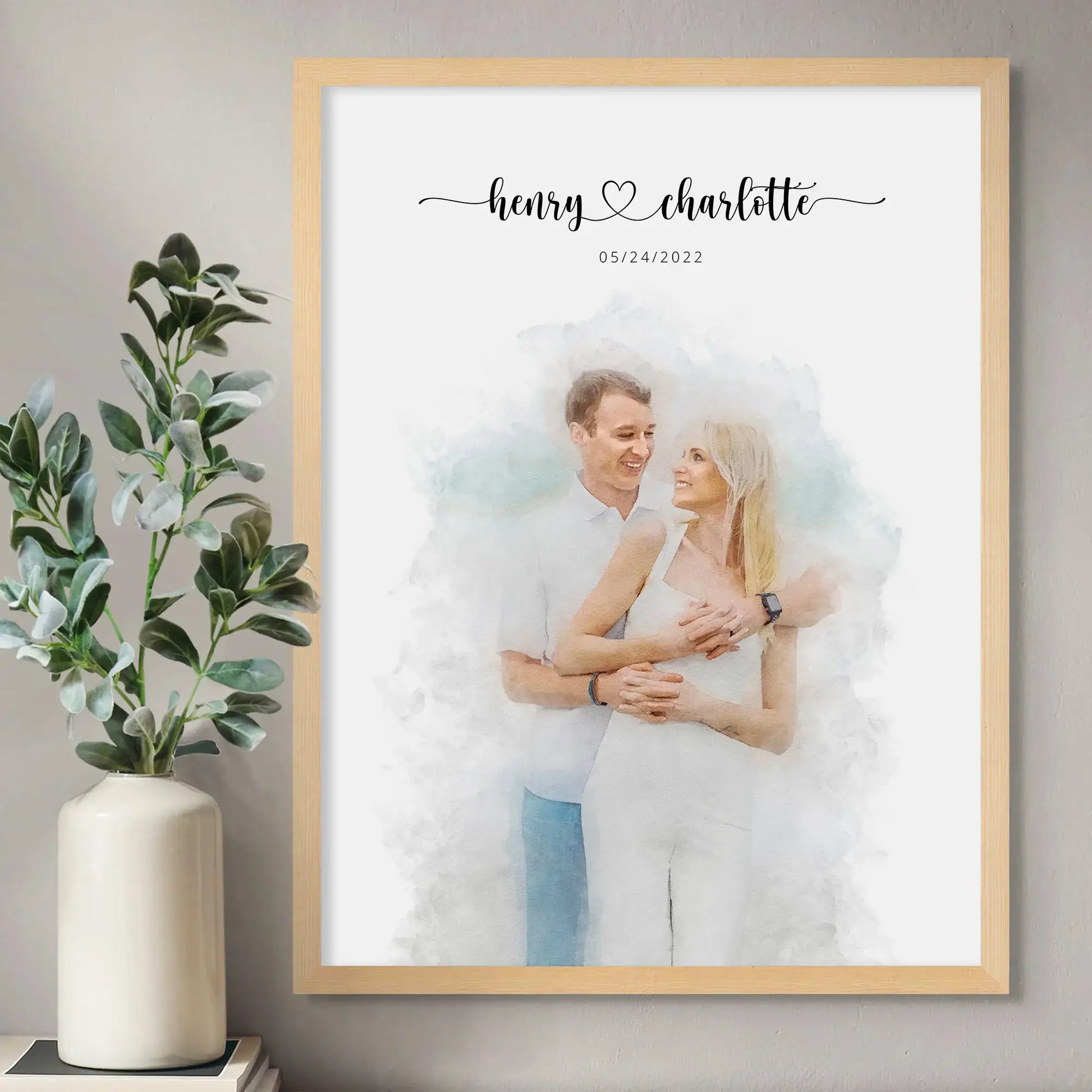 Express your love with a beautiful custom portrait digitally created from your photo! Create an eye-catching artwork of you and your partner, printed on thick, durable, gallery-grade paper. The matte frame is made from wood from renewable forests and ships with ready-to-hang hardware.