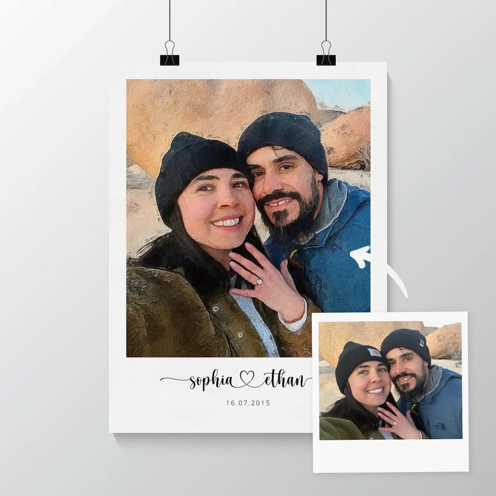 Upload your favorite photo together. Pick the photo that captures your special bond - whether it's an engagement, a shared laugh, or a memory from the day it all began. Upload it when you place your order, or send it to us later if you're still choosing the perfect one. Want to add your furry friend to the portrait? Select our 'Add a Pet' add-on and we'll add them as if they were really there. Don't forget to check out our Image Guidelines for the best results!