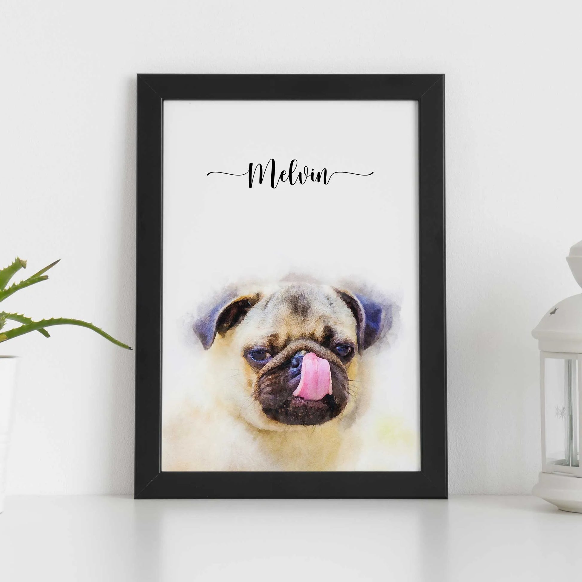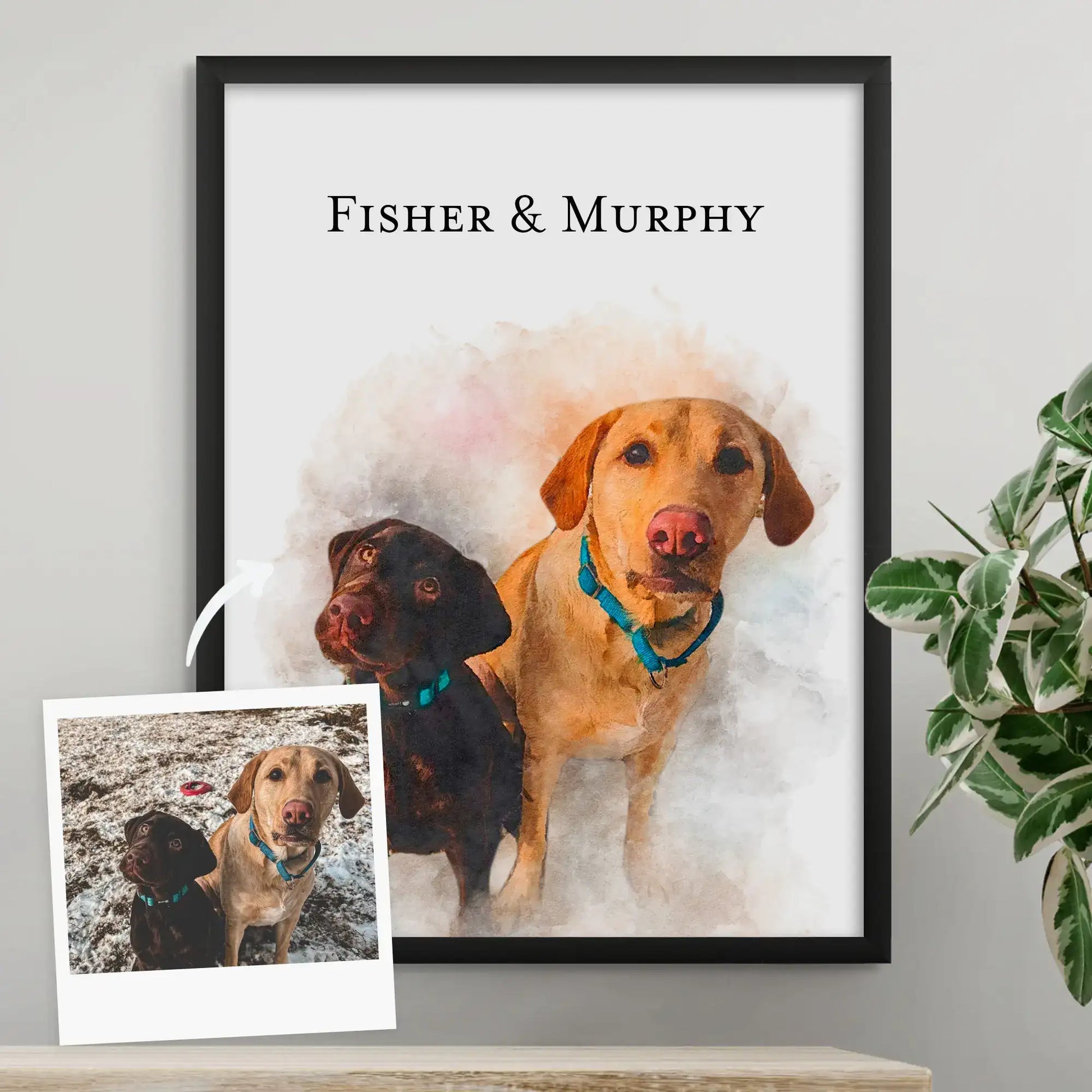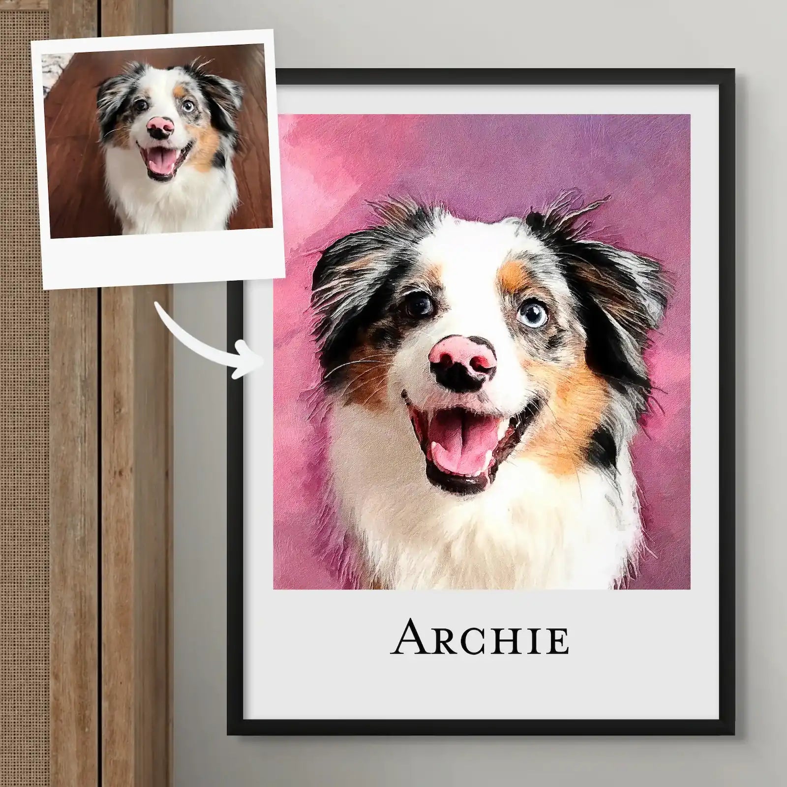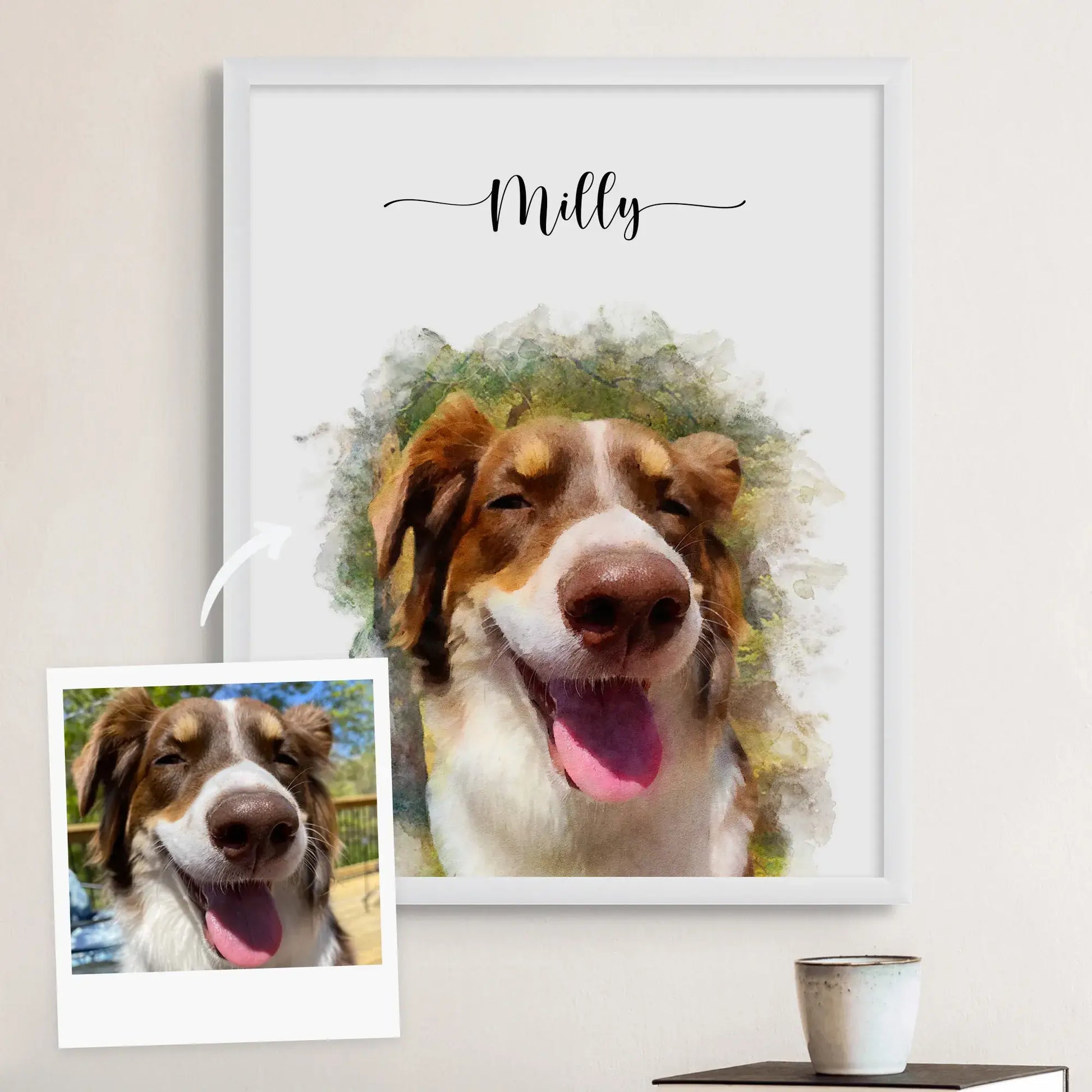 Celebrate your pet with a colorful watercolor, oil or sketch portrait digitally created from your photo! Create an eye-catching custom portrait of your pet, printed on thick, durable, gallery-grade paper. The matte frame is made from wood from renewable forests and ships with ready-to-hang hardware.