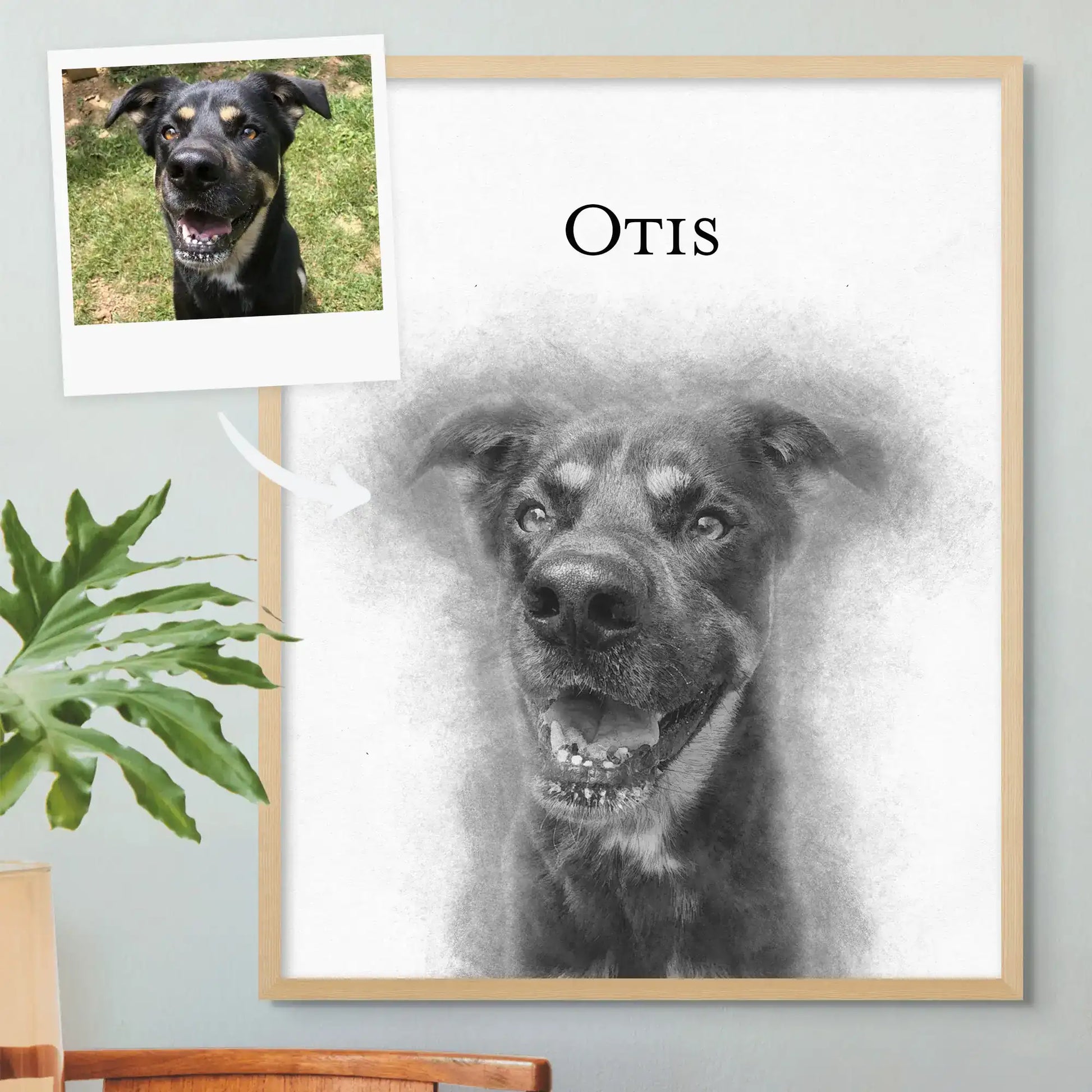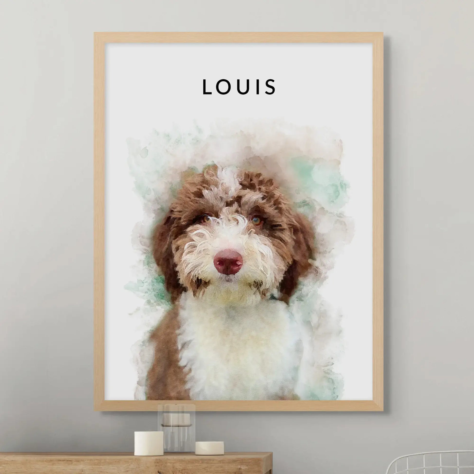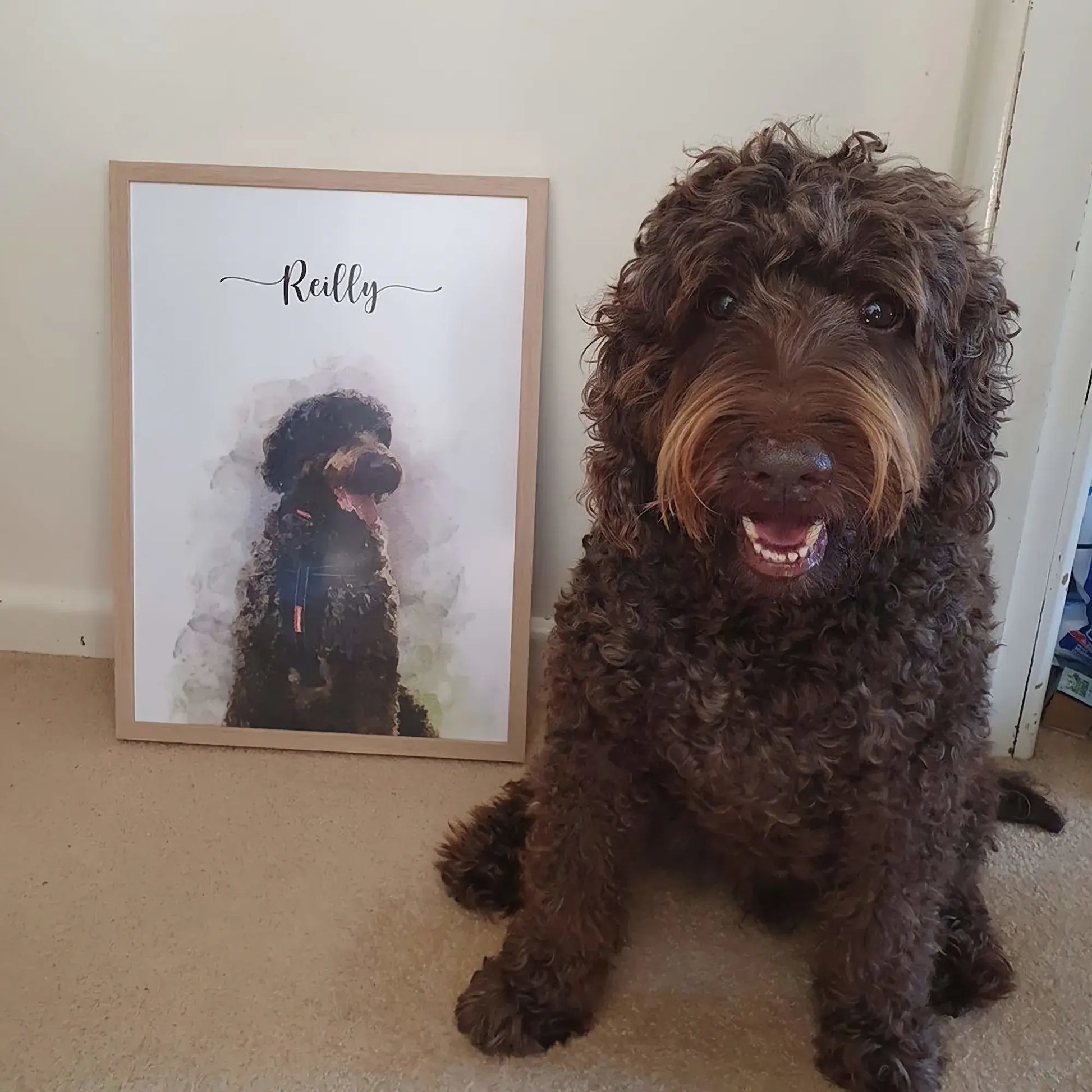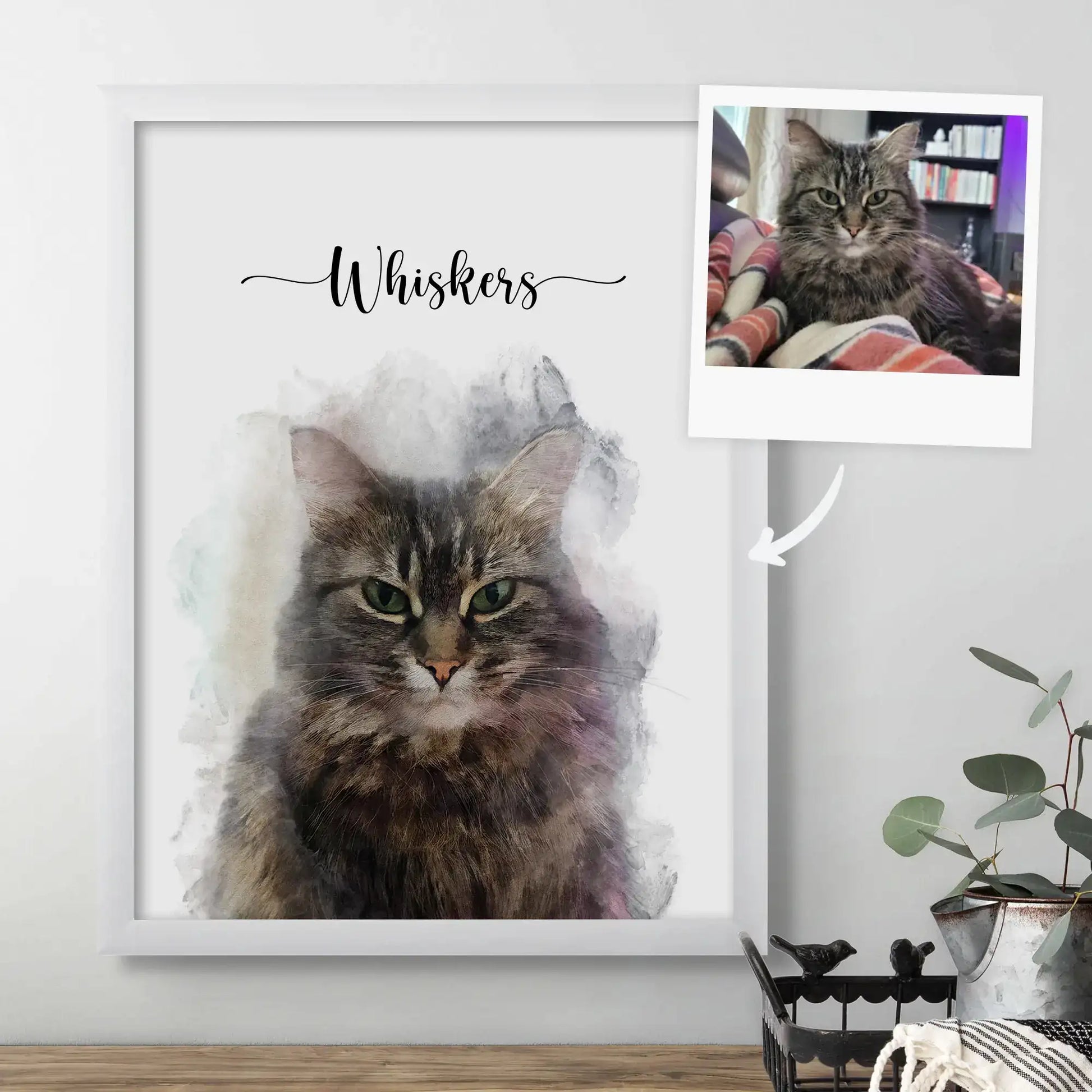 Celebrate your pet with a colorful watercolor, oil or sketch portrait digitally created from your photo! Create an eye-catching custom portrait of your pet, printed on thick, durable, gallery-grade paper. The matte frame is made from wood from renewable forests and ships with ready-to-hang hardware.