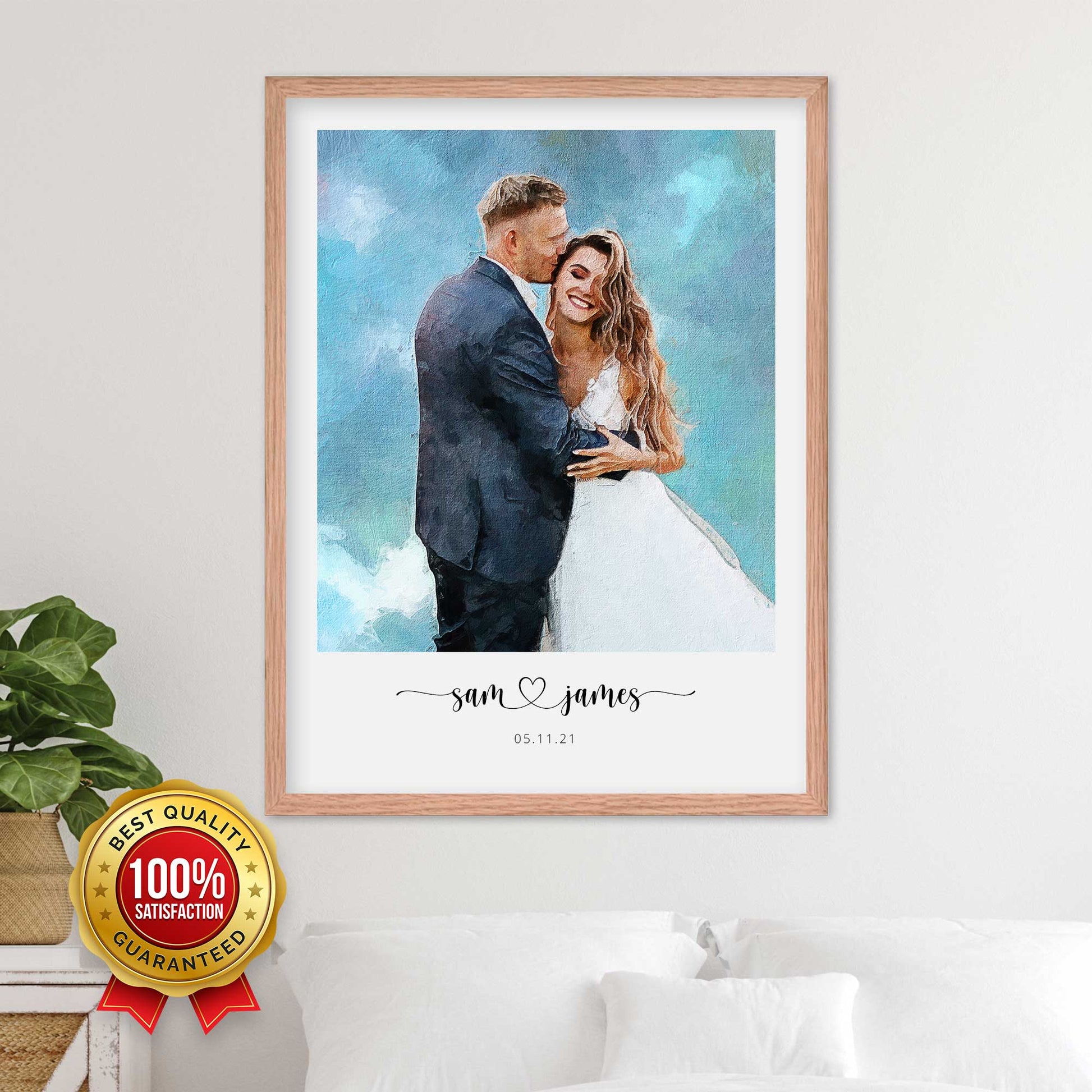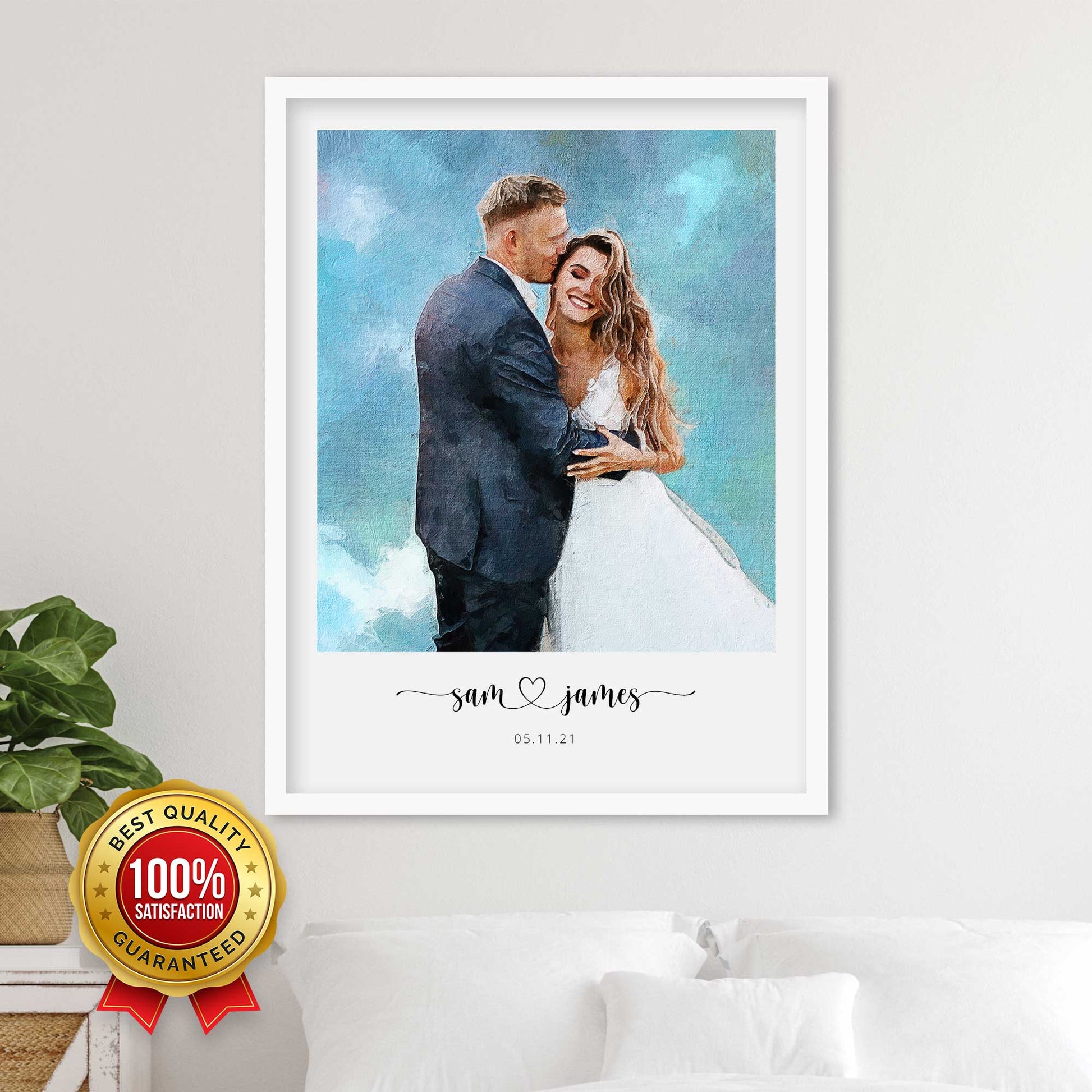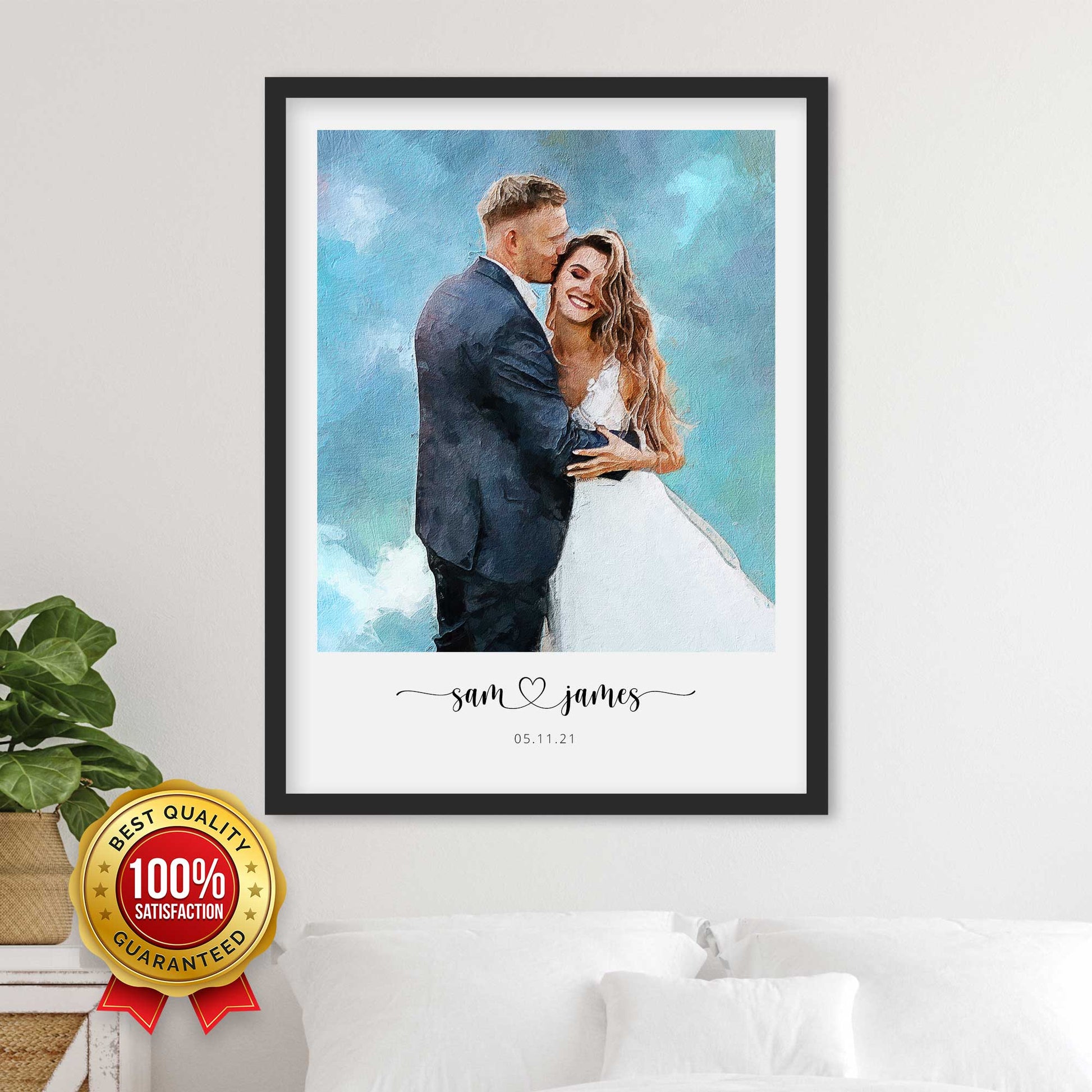 Express your love and commemorate your wedding day with a colorful and eye-catching portrait, printed on thick, durable, gallery-grade paper. The matte frame is made from wood from renewable forests and ships with ready-to-hang hardware.