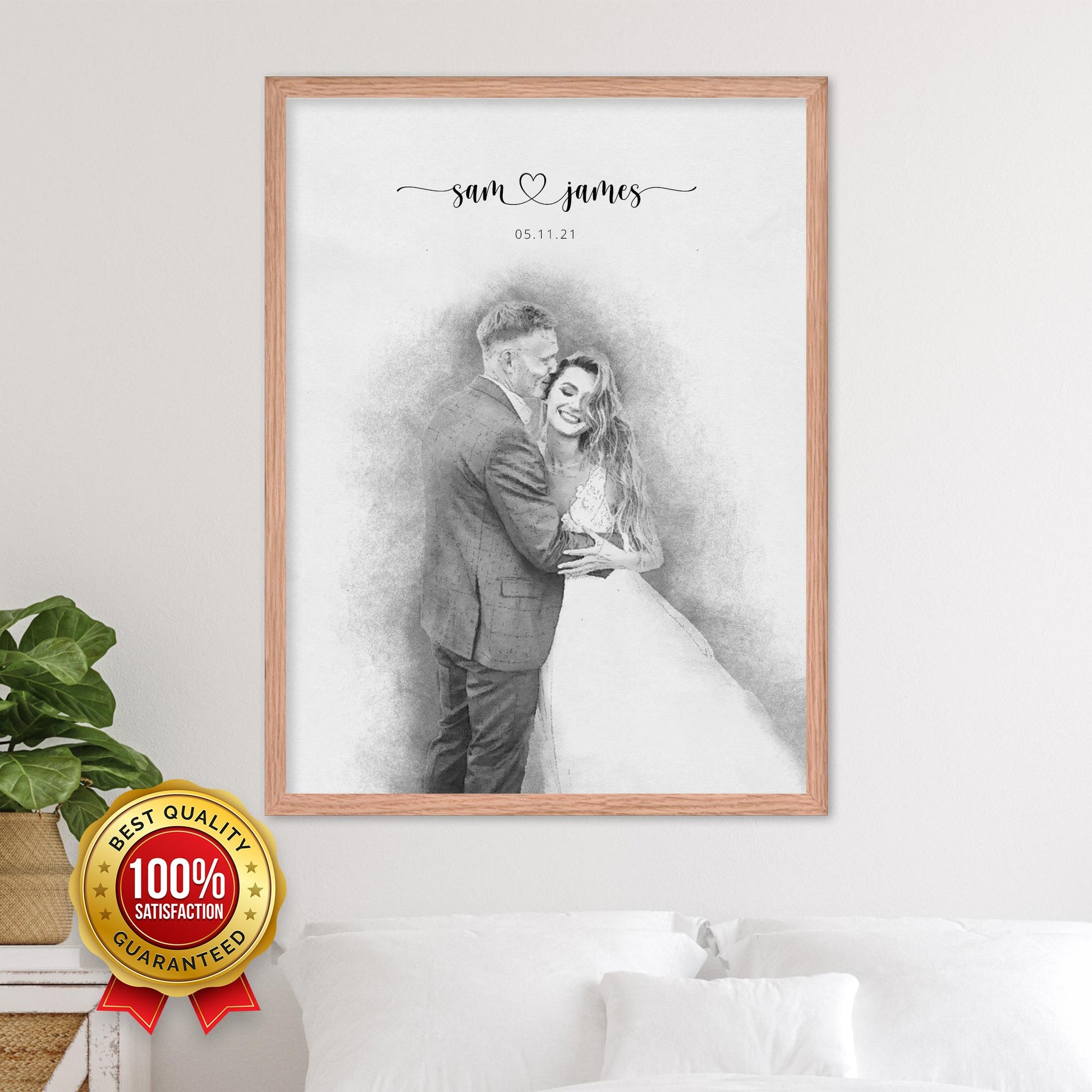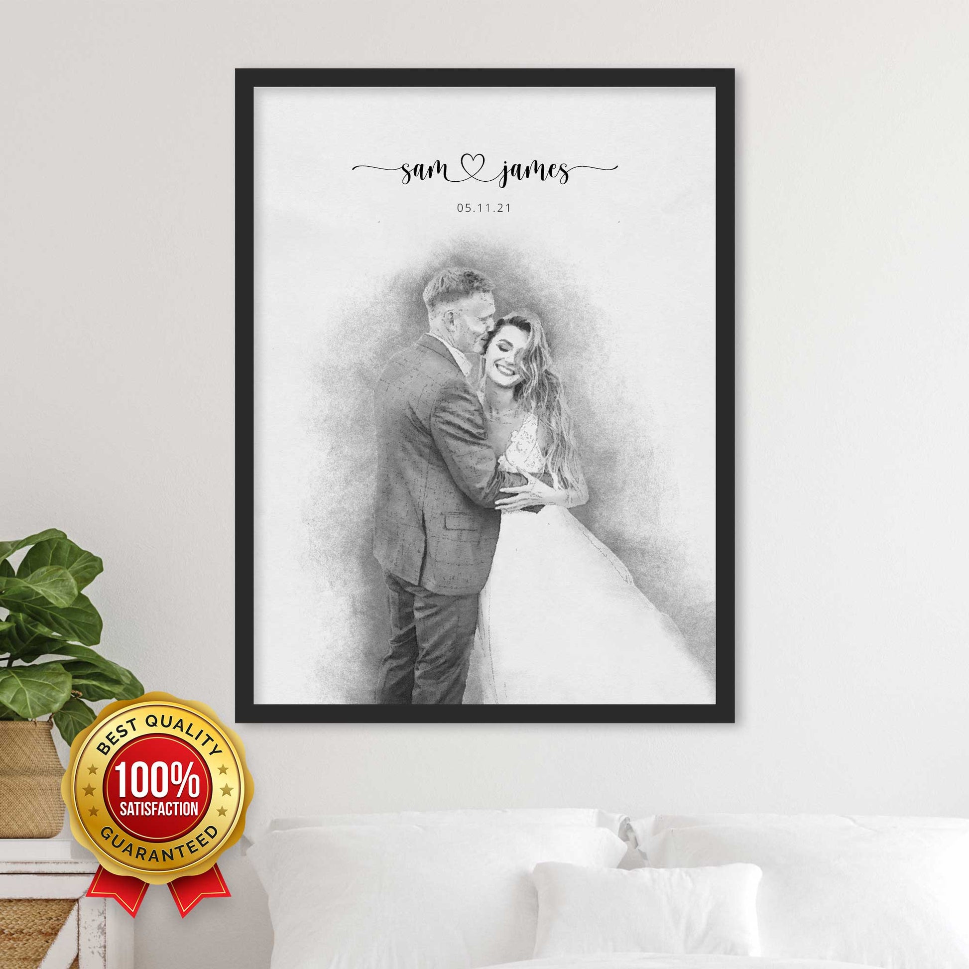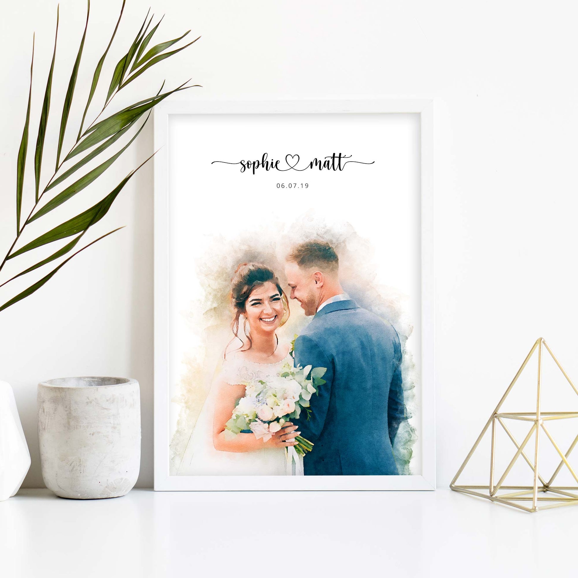 Express your love and commemorate your wedding day with a colorful and eye-catching portrait, printed on thick, durable, gallery-grade paper. The matte frame is made from wood from renewable forests and ships with ready-to-hang hardware.
